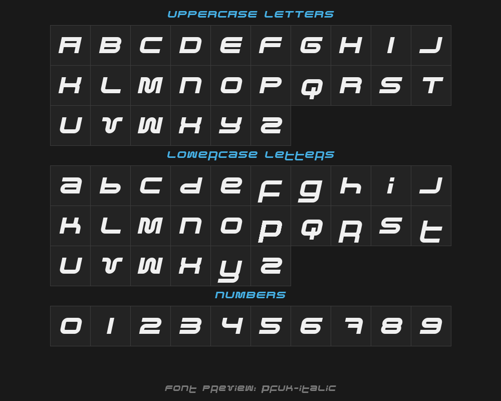 pfuk-italic is a font file with a size of 0.02 MB. The full font name is Pfuk Italic, Version 1.0 version. It contains 92 characters, supports 8 Chinese characters. The copyright belongs to Pfuk. pfuk-italic font is available for free download, but commercial use requires confirmation on the Pfuk official website whether it's free for commercial use.