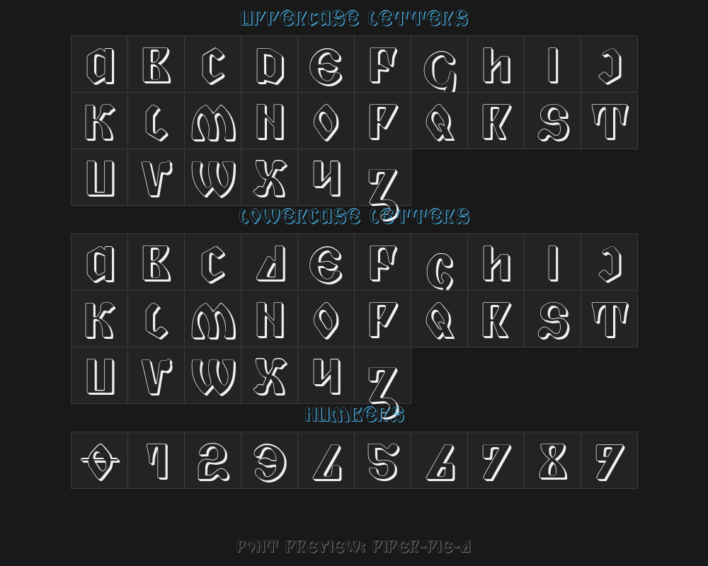 piper-pie-3d is a font file with a size of 0.13 MB. The full font name is Piper Pie 3D, 001.000 version. It contains 219 characters, supports 8 Chinese characters. The copyright belongs to Piper Pie 3D. piper-pie-3d font is available for free download, but commercial use requires confirmation on the Piper Pie 3D official website whether it's free for commercial use.