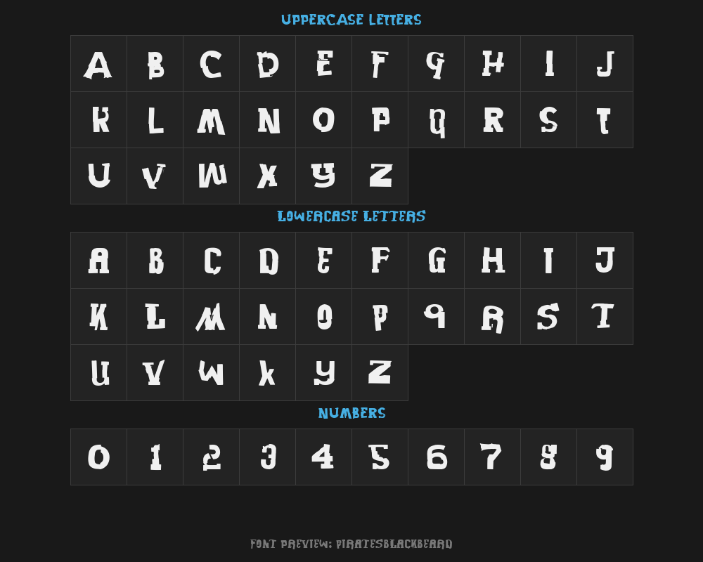 piratesblackbeard is a font file with a size of 0.05 MB. The full font name is PiratesBlackbeard, Macromedia Fontographer 4.1.2 14.07.2005 version. It contains 252 characters, supports 8 Chinese characters. The copyright belongs to PiratesBlackbeard. piratesblackbeard font is available for free download, but commercial use requires confirmation on the PiratesBlackbeard official website whether it's free for commercial use.