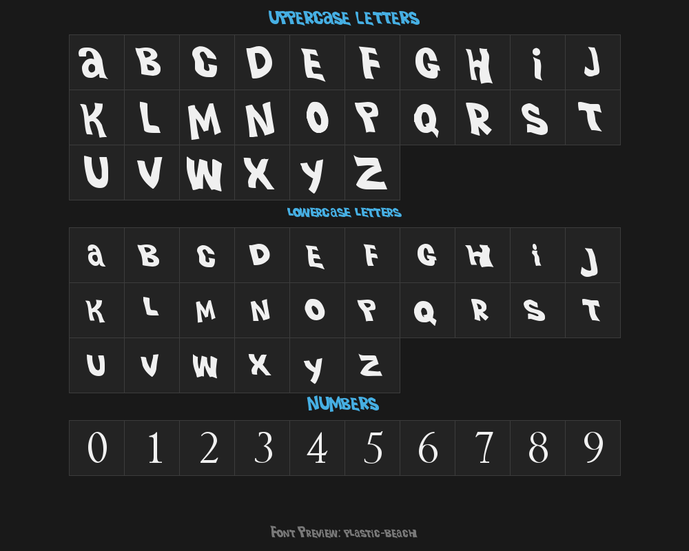 plastic-beach is a font file with a size of 0.02 MB. The full font name is Plastic Beach, Version 1.00 March 20, 2010, initial release version. It contains 76 characters, supports 8 Chinese characters. The copyright belongs to Plastic Beach. plastic-beach font is available for free download, but commercial use requires confirmation on the Plastic Beach official website whether it's free for commercial use.