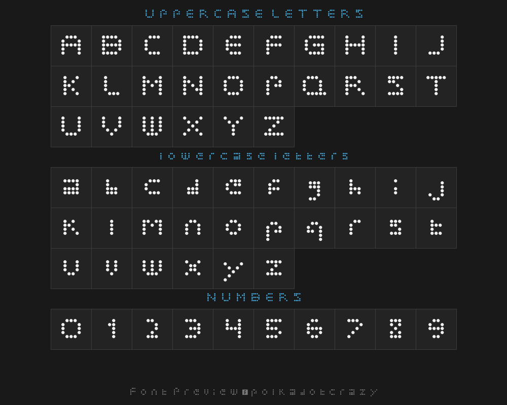 polkadotcrazy is a font file with a size of 0.03 MB. The full font name is PolkaDotCrazy, Version 1.0 version. It contains 63 characters, supports 8 Chinese characters. The copyright belongs to PolkaDotCrazy. polkadotcrazy font is available for free download, but commercial use requires confirmation on the PolkaDotCrazy official website whether it's free for commercial use.
