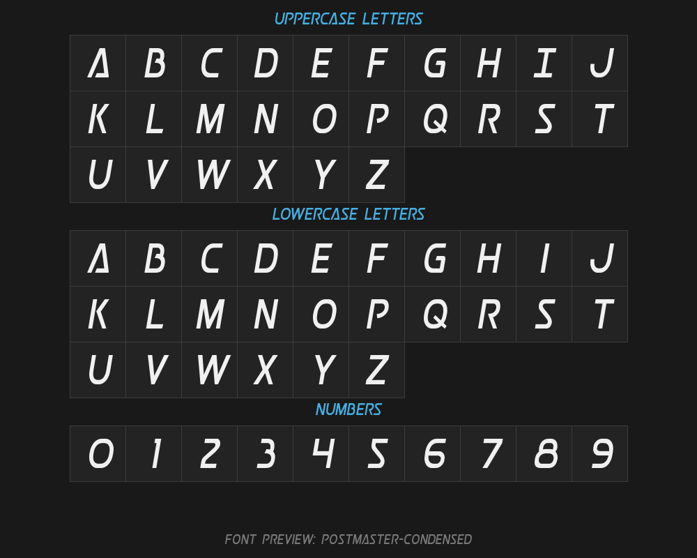 postmaster-condensed is a font file with a size of 0.03 MB. The full font name is Postmaster Condensed, Version 2.0; 2015 version. It contains 218 characters, supports 8 Chinese characters. The copyright belongs to Postmaster Condensed. postmaster-condensed font is available for free download, but commercial use requires confirmation on the Postmaster Condensed official website whether it's free for commercial use.