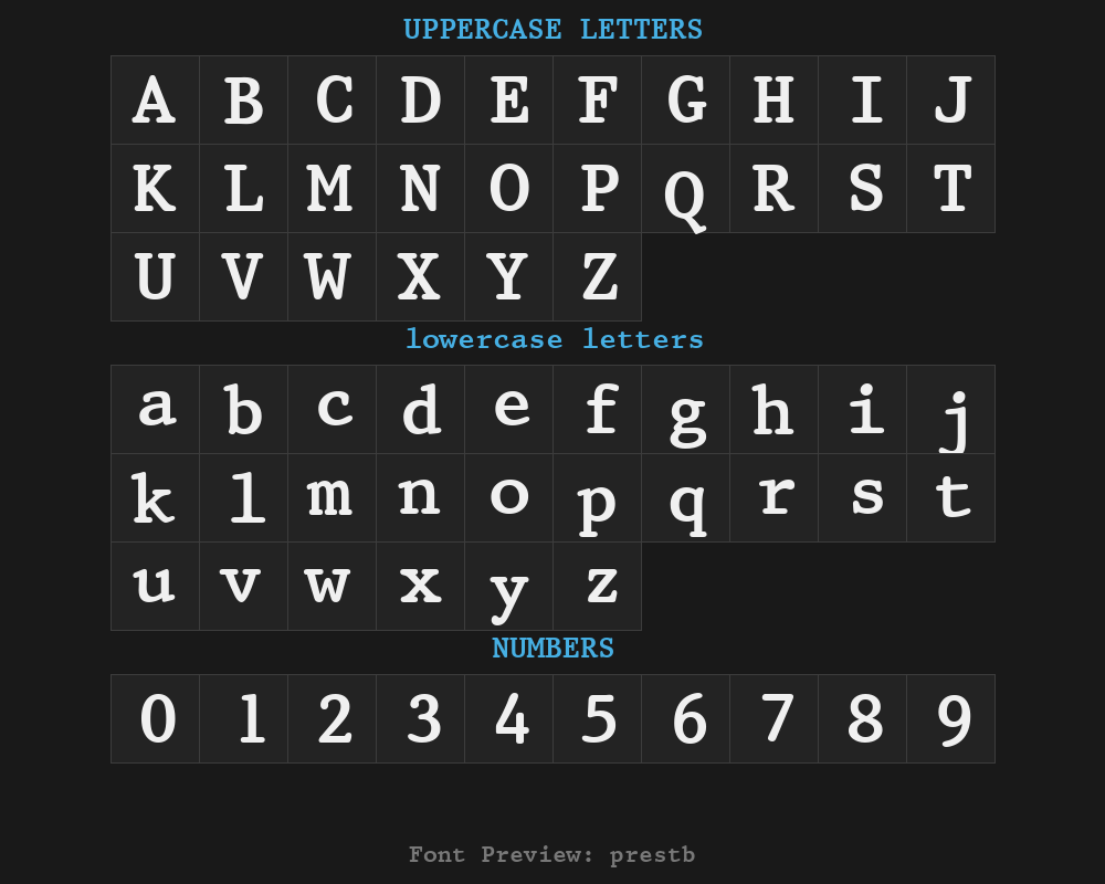 prest12b is a font file with a size of 0.05 MB. The full font name is Prestige 12 Pitch Bold BT, mfgpctt-v1.53 Monday, February 1, 1993 11 27 54 am (EST) version. It contains 257 characters, supports 8 Chinese characters. The copyright belongs to Prestige12 BT. prest12b font is available for free download, but commercial use requires confirmation on the Prestige12 BT official website whether it's free for commercial use.
