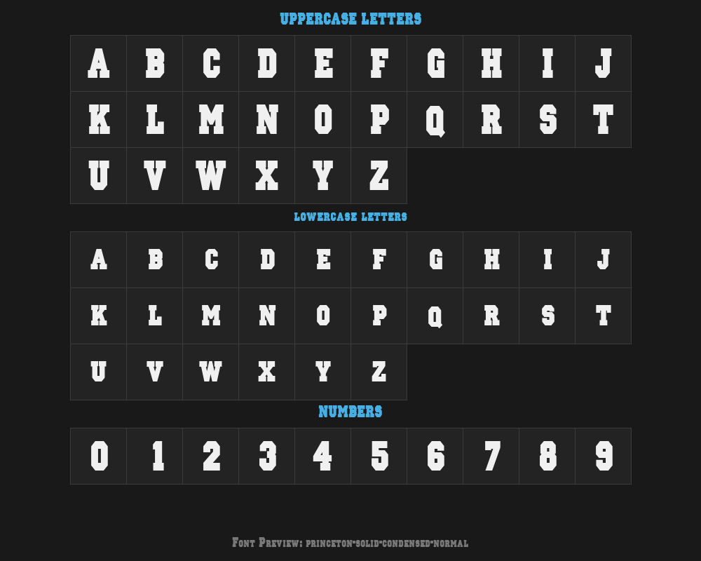 princeton-solid-condensed-normal is a font file with a size of 0.03 MB. The full font name is Princeton solid Condensed Normal, 1.0 Wed Jul 28 18 57 06 1993 version. It contains 203 characters, supports 8 Chinese characters. The copyright belongs to Princeton solid Condensed. princeton-solid-condensed-normal font is available for free download, but commercial use requires confirmation on the Princeton solid Condensed official website whether it's free for commercial use.