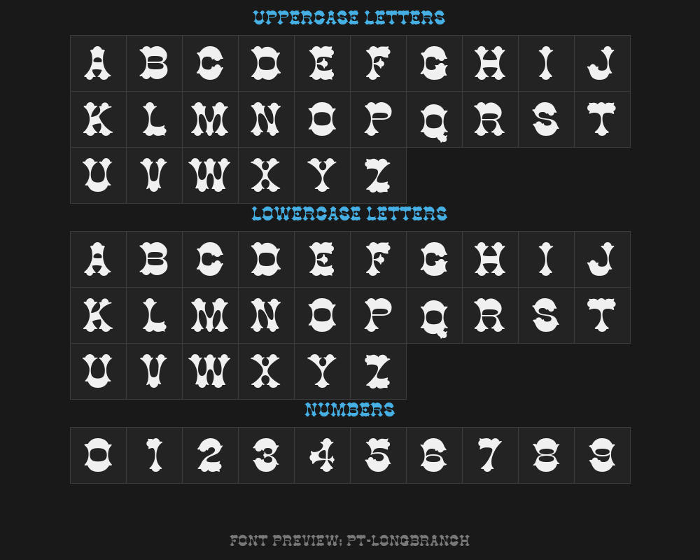 pt-longbranch is a font file with a size of 0.09 MB. The full font name is PT Longbranch, 1.0 Mon May 03 13 27 04 1993 version. It contains 205 characters, supports 8 Chinese characters. The copyright belongs to PT Longbranch. pt-longbranch font is available for free download, but commercial use requires confirmation on the PT Longbranch official website whether it's free for commercial use.