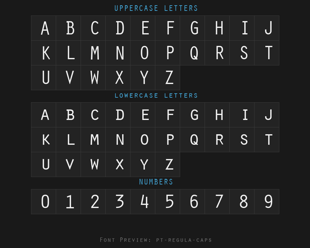pt-regula-caps is a font file with a size of 0.05 MB. The full font name is PT Regula Caps, 1.0 Mon May 03 15 16 45 1993 version. It contains 228 characters, supports 8 Chinese characters. The copyright belongs to PT Regula Caps. pt-regula-caps font is available for free download, but commercial use requires confirmation on the PT Regula Caps official website whether it's free for commercial use.
