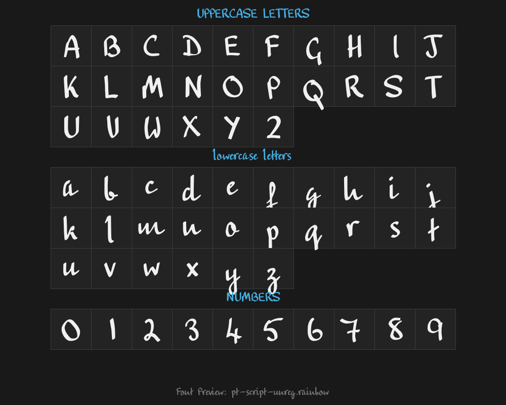pt-script-unreg.rainbow is a font file with a size of 0.03 MB. The full font name is PT Script (Unreg.) Rainbow, 1998; 1.0, initial release, unregistered version. It contains 189 characters, supports 8 Chinese characters. The copyright belongs to PT Script (Unreg.) Rainbow. pt-script-unreg.rainbow font is available for free download, but commercial use requires confirmation on the PT Script (Unreg.) Rainbow official website whether it's free for commercial use.