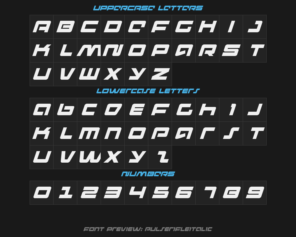 pulserifleitalic is a font file with a size of 0.04 MB. The full font name is Pulse Rifle Italic, 001.000 version. It contains 219 characters, supports 8 Chinese characters. The copyright belongs to Pulse Rifle Italic. pulserifleitalic font is available for free download, but commercial use requires confirmation on the Pulse Rifle Italic official website whether it's free for commercial use.