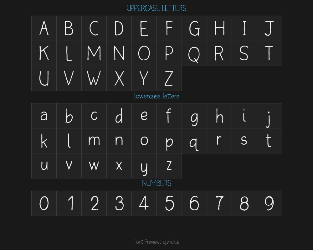 qlinickle is a font file with a size of 0.08 MB. The full font name is Qlinickle, Version 1.00 July 12, 2014, initial release version. It contains 203 characters, supports 8 Chinese characters. The copyright belongs to Qlinickle. qlinickle font is available for free download, but commercial use requires confirmation on the Qlinickle official website whether it's free for commercial use.