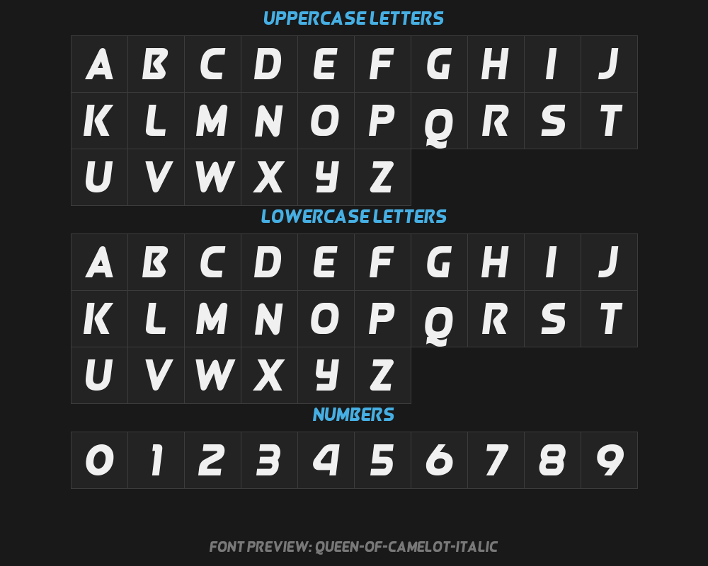 queen-of-camelot-italic is a font file with a size of 0.12 MB. The full font name is Queen of Camelot Italic, Version 3.00 February 19, 2016 version. It contains 369 characters, supports 8 Chinese characters. The copyright belongs to Queen of Camelot. queen-of-camelot-italic font is available for free download, but commercial use requires confirmation on the Queen of Camelot official website whether it's free for commercial use.