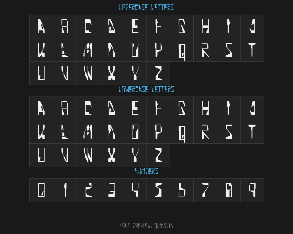 quinolin is a font file with a size of 0.02 MB. The full font name is Quinoline, Feb 21, 1997 (fixed m) version. It contains 98 characters, supports 8 Chinese characters. The copyright belongs to Quinoline. quinolin font is available for free download, but commercial use requires confirmation on the Quinoline official website whether it's free for commercial use.