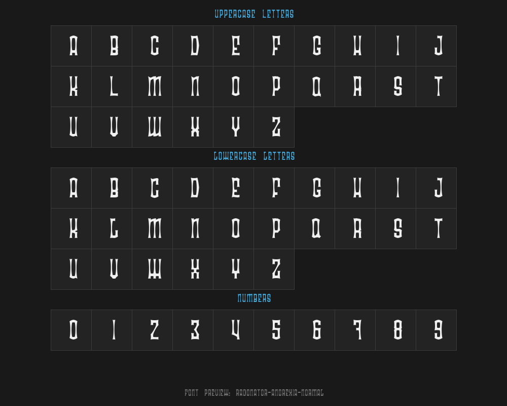 radonator-anorexia-normal is a font file with a size of 0.03 MB. The full font name is Radonator Anorexia Normal, 1.0 Cosmonaut Fonts - cosmonaut@icenet.fi version. It contains 94 characters, supports 8 Chinese characters. The copyright belongs to Radonator Anorexia. radonator-anorexia-normal font is available for free download, but commercial use requires confirmation on the Radonator Anorexia official website whether it's free for commercial use.