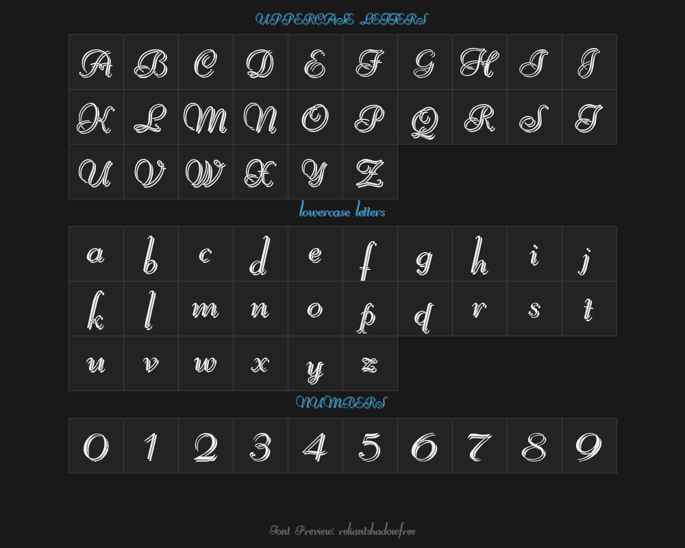 reliantshadowfree is a font file with a size of 0.13 MB. The full font name is ReliantShadowFree, Version 1.000 2012 initial release version. It contains 230 characters, supports 8 Chinese characters. The copyright belongs to Reliant Shadow Free. reliantshadowfree font is available for free download, but commercial use requires confirmation on the Reliant Shadow Free official website whether it's free for commercial use.