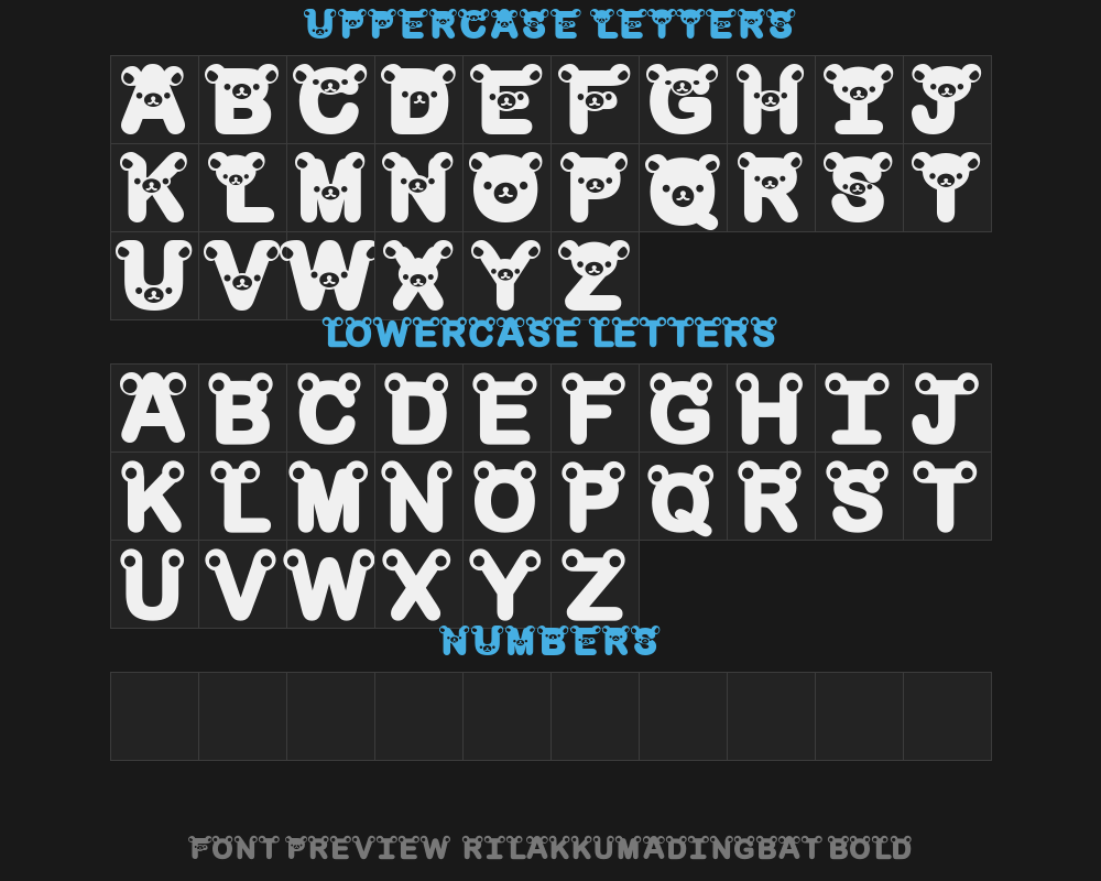 rilakkumadingbat-bold is a font file with a size of 0.06 MB. The full font name is rilakkuma dingbat Bold, Version 1.00 2011 version. It contains 55 characters, supports 8 Chinese characters. The copyright belongs to rilakkuma dingbat. rilakkumadingbat-bold font is available for free download, but commercial use requires confirmation on the rilakkuma dingbat official website whether it's free for commercial use.