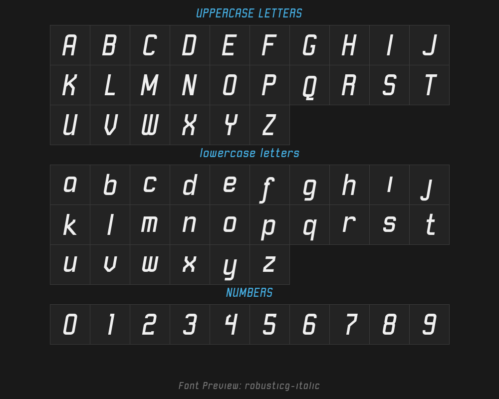 robusticg-italic is a font file with a size of 0.03 MB. The full font name is RobustICG-Italic, 001.000 version. It contains 244 characters, supports 8 Chinese characters. The copyright belongs to RobustICG. robusticg-italic font is available for free download, but commercial use requires confirmation on the RobustICG official website whether it's free for commercial use.