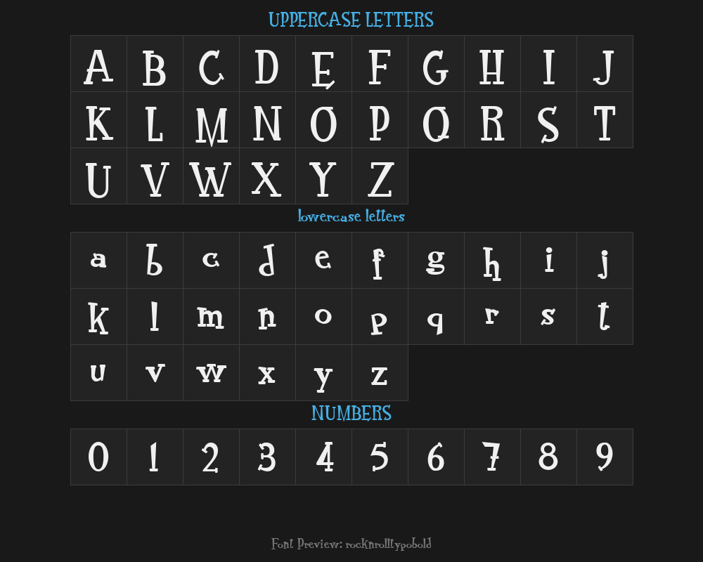 rocknrolltypobold is a font file with a size of 0.11 MB. The full font name is RocknRollTypobold, Version 1.000 version. It contains 212 characters, supports 8 Chinese characters. The copyright belongs to RocknRoll Typo bold. rocknrolltypobold font is available for free download, but commercial use requires confirmation on the RocknRoll Typo bold official website whether it's free for commercial use.