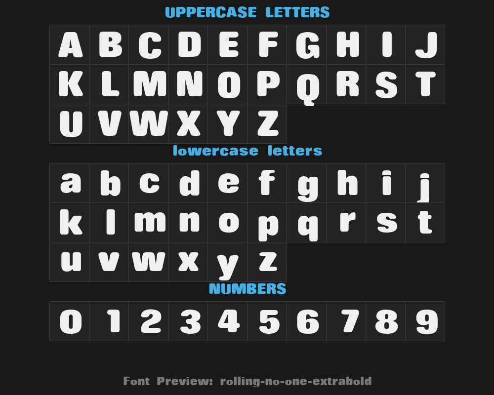 rolling-no-one-extrabold is a font file with a size of 0.03 MB. The full font name is Rolling No One ExtraBold, 1.0 version. It contains 196 characters, supports 8 Chinese characters. The copyright belongs to Rolling No One. rolling-no-one-extrabold font is available for free download, but commercial use requires confirmation on the Rolling No One official website whether it's free for commercial use.