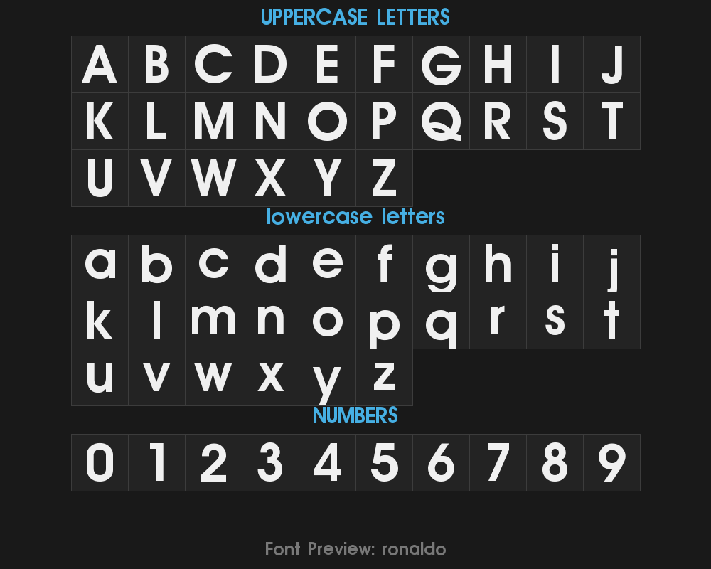 ronaldo is a font file with a size of 0.01 MB. The full font name is Ronaldo, Version 1 version. It contains 105 characters, supports 8 Chinese characters. The copyright belongs to Ronaldo. ronaldo font is available for free download, but commercial use requires confirmation on the Ronaldo official website whether it's free for commercial use.