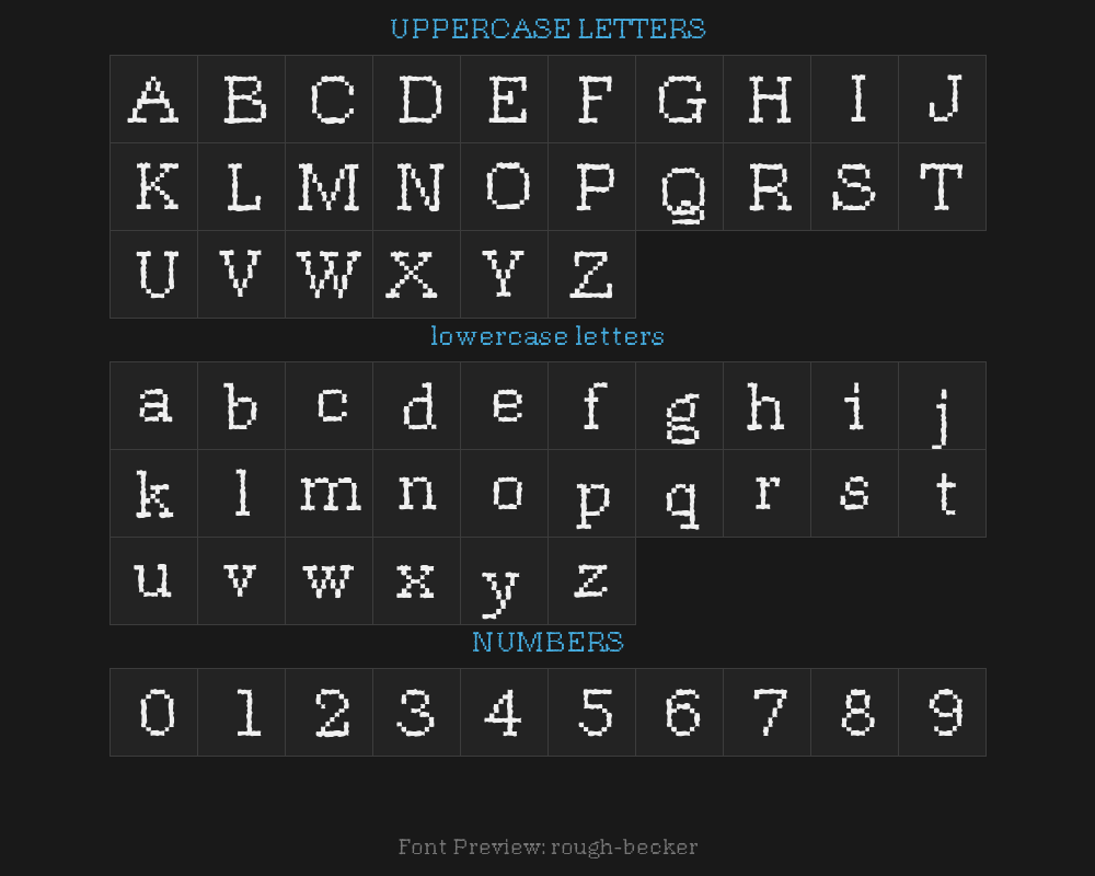 rough17-becker is a font file with a size of 0.15 MB. The full font name is Rough17 Becker, Version 001.005 version. It contains 248 characters, supports 8 Chinese characters. The copyright belongs to Rough17 Becker. rough17-becker font is available for free download, but commercial use requires confirmation on the Rough17 Becker official website whether it's free for commercial use.