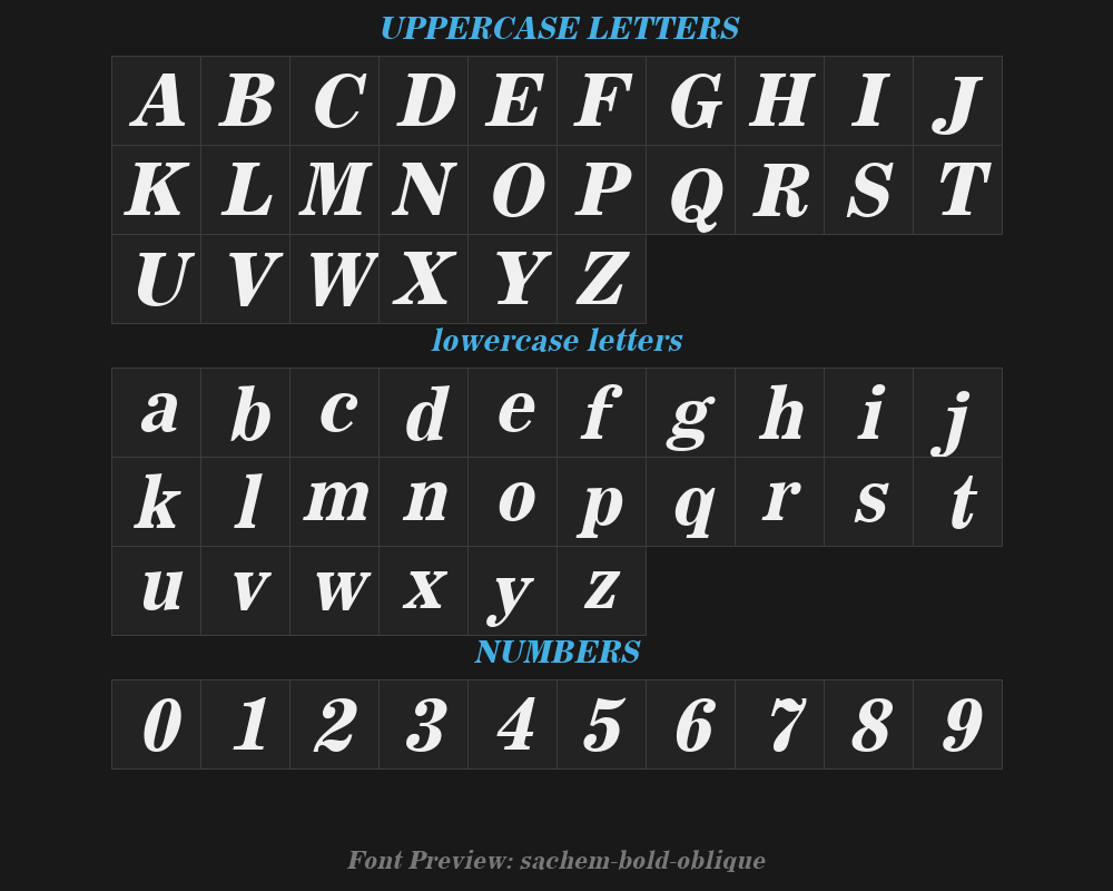 sachem-bold-oblique is a font file with a size of 0.05 MB. The full font name is Sachem Bold-Oblique, 1.0 Tue Sep 20 18 50 35 1994 version. It contains 230 characters, supports 8 Chinese characters. The copyright belongs to Sachem. sachem-bold-oblique font is available for free download, but commercial use requires confirmation on the Sachem official website whether it's free for commercial use.