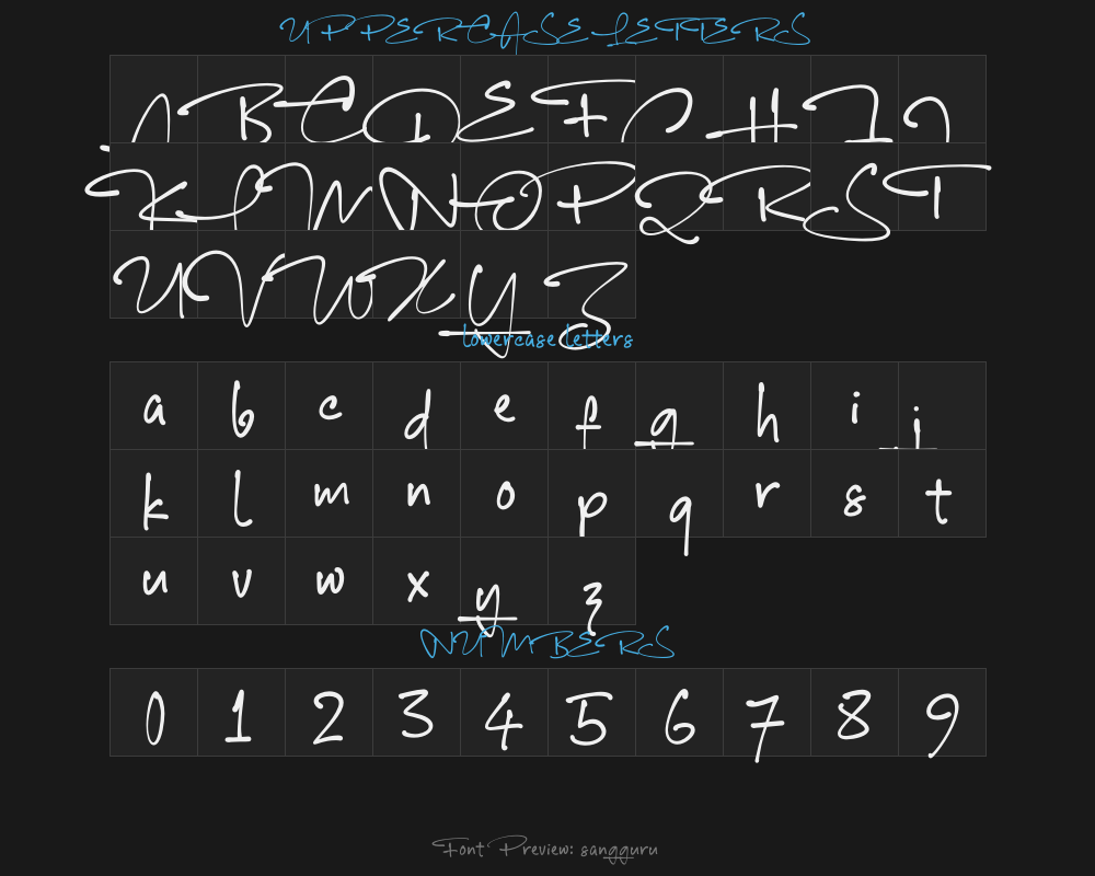sangguru is a font file with a size of 0.04 MB. The full font name is Sang Guru, Version 1.00;December 9, 2021;FontCreator 12.0.0.2567 64-bit version. It contains 166 characters, supports 8 Chinese characters. The copyright belongs to Sang Guru. sangguru font is available for free download, but commercial use requires confirmation on the Sang Guru official website whether it's free for commercial use.