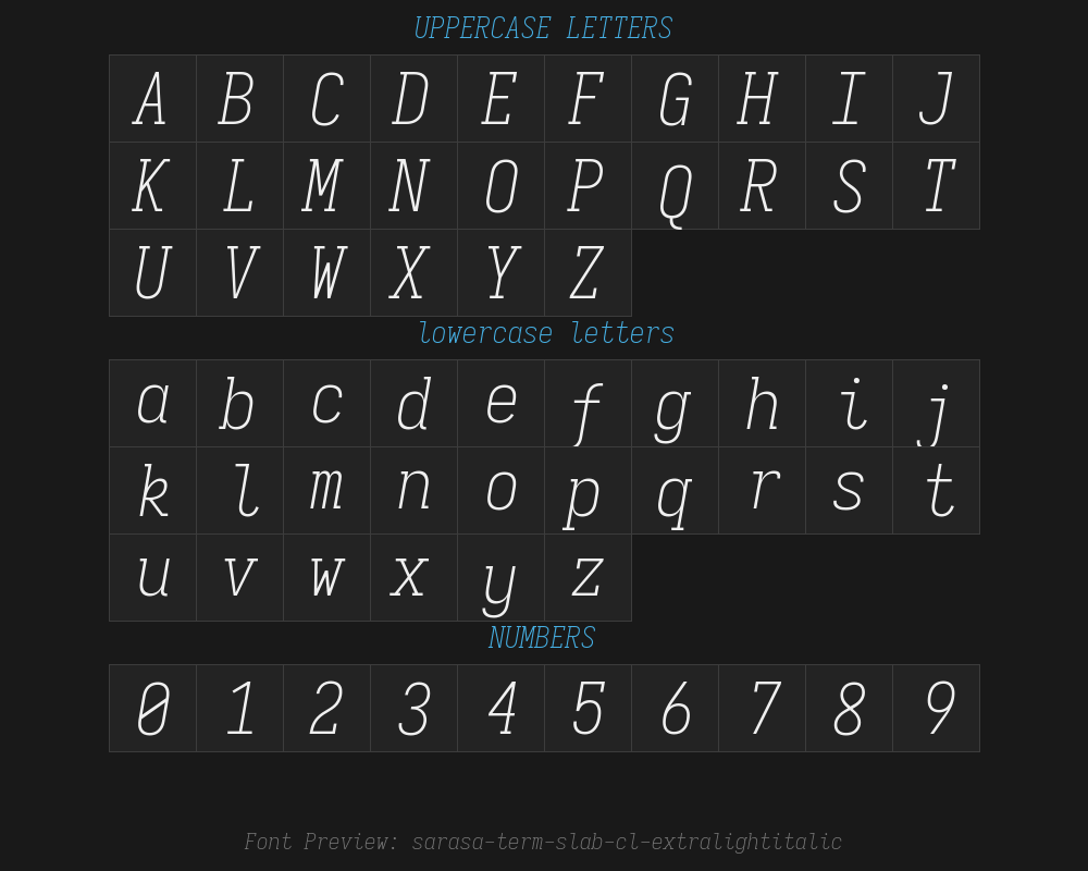 Overview:sarasa-term-slab-cl-extralightitalicFont