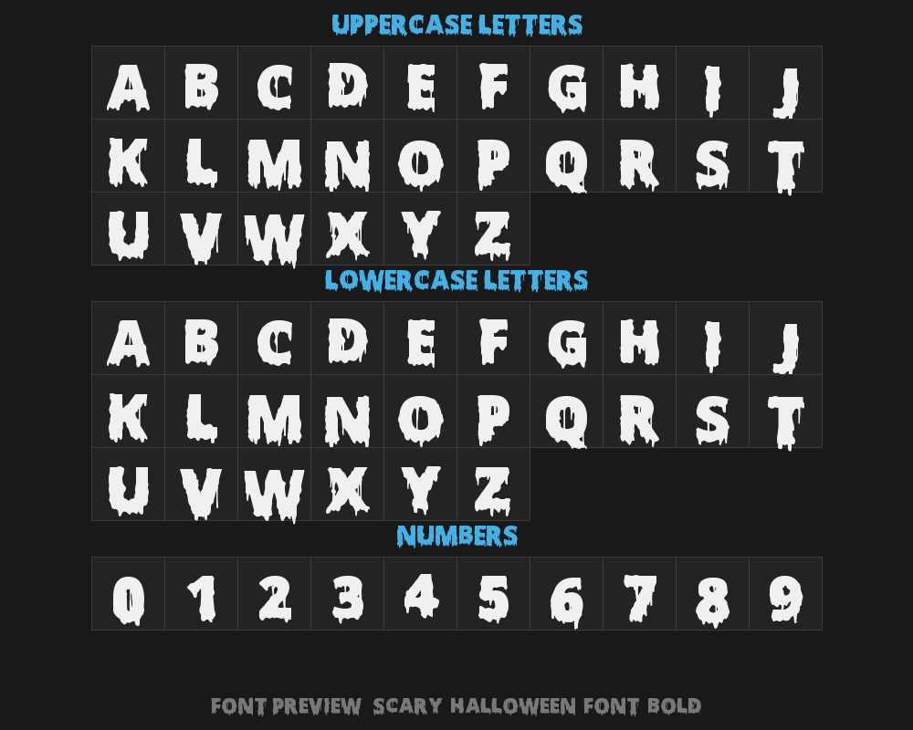 scary-halloween-font-bold is a font file with a size of 0.03 MB. The full font name is Scary Halloween Font Bold, Version 1.00 September 7, 2013, initial release version. It contains 242 characters, supports 8 Chinese characters. The copyright belongs to Scary Halloween Font. scary-halloween-font-bold font is available for free download, but commercial use requires confirmation on the Scary Halloween Font official website whether it's free for commercial use.