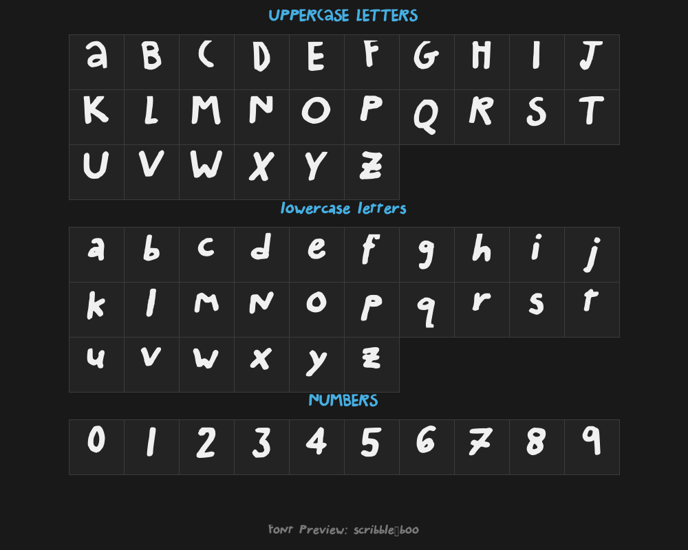 scribble_boo is a font file with a size of 0.02 MB. The full font name is Scribble_Boo, Version 001.000 version. It contains 138 characters, supports 8 Chinese characters. The copyright belongs to Scribble_Boo. scribble_boo font is available for free download, but commercial use requires confirmation on the Scribble_Boo official website whether it's free for commercial use.