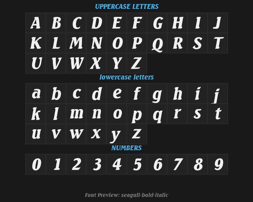 seagull-bold-italic is a font file with a size of 0.07 MB. The full font name is Seagull Bold Italic, Altsys Fontographer 3.5 9 23 93 version. It contains 207 characters, supports 8 Chinese characters. The copyright belongs to Seagull. seagull-bold-italic font is available for free download, but commercial use requires confirmation on the Seagull official website whether it's free for commercial use.