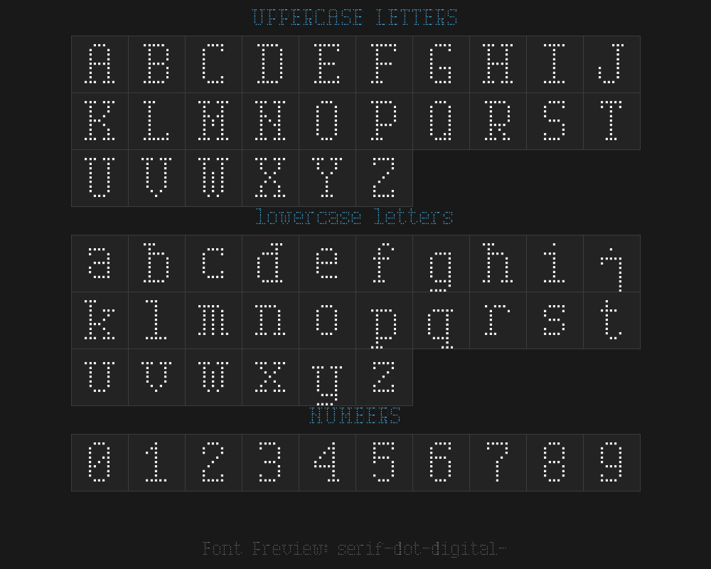 serif-dot-digital-7 is a font file with a size of 0.08 MB. The full font name is Serif Dot Digital-7, Version 1.000 version. It contains 312 characters, supports 8 Chinese characters. The copyright belongs to Serif Dot Digital-7. serif-dot-digital-7 font is available for free download, but commercial use requires confirmation on the Serif Dot Digital-7 official website whether it's free for commercial use.