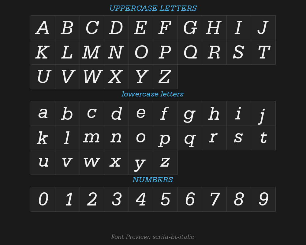 | File name | serifa-bt-italic.ttf |