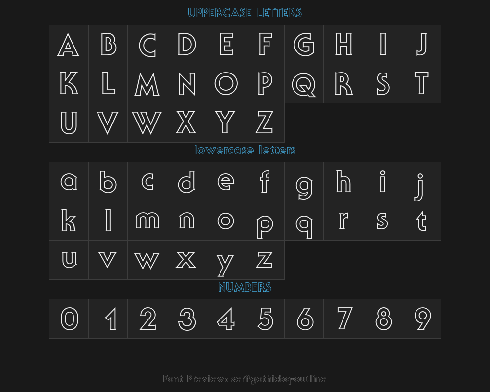 serifgothicbq-outline is a font file with a size of 0.05 MB. The full font name is SerifGothicBQ-Outline, 001.000 version. It contains 200 characters, supports 8 Chinese characters. The copyright belongs to Serif Gothic BQ. serifgothicbq-outline font is available for free download, but commercial use requires confirmation on the Serif Gothic BQ official website whether it's free for commercial use.