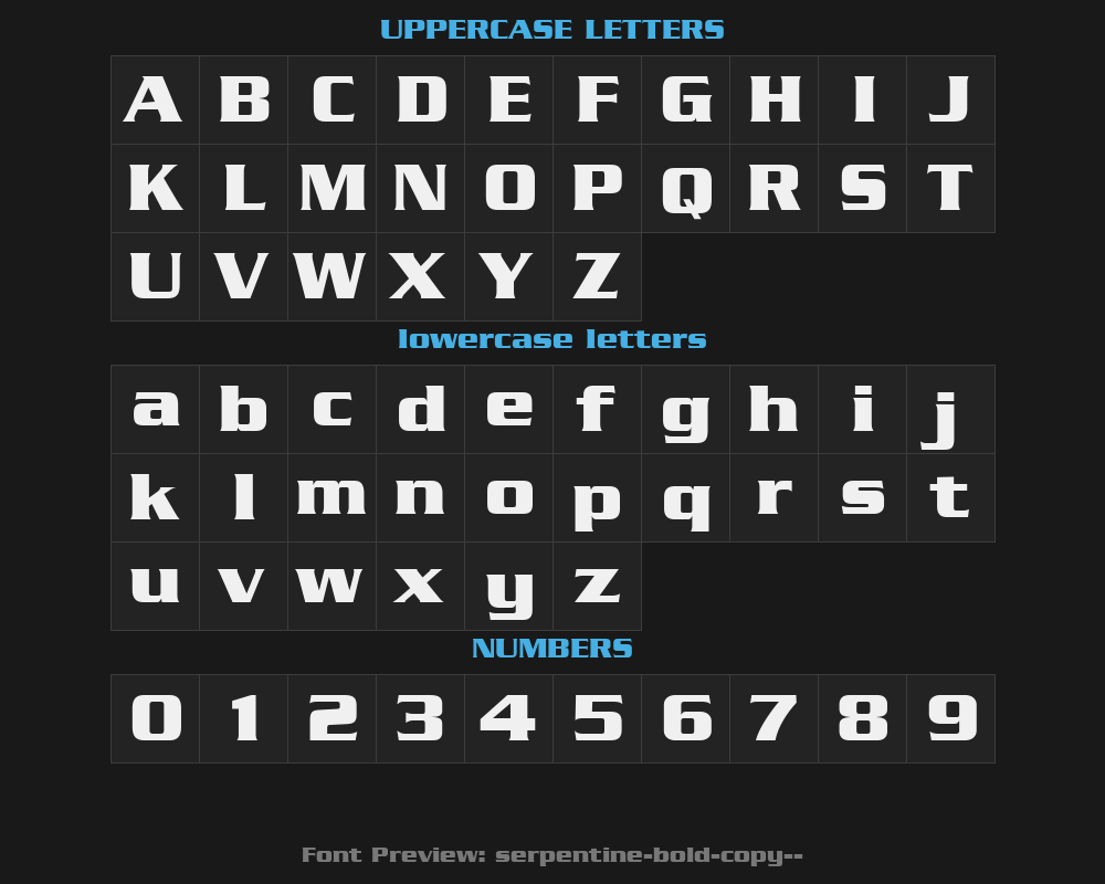 serpentine-bold-copy-1- is a font file with a size of 0.04 MB. The full font name is Serpentine Bold, Version 001.000 version. It contains 235 characters, supports 8 Chinese characters. The copyright belongs to Serpentine. serpentine-bold-copy-1- font is available for free download, but commercial use requires confirmation on the Serpentine official website whether it's free for commercial use.