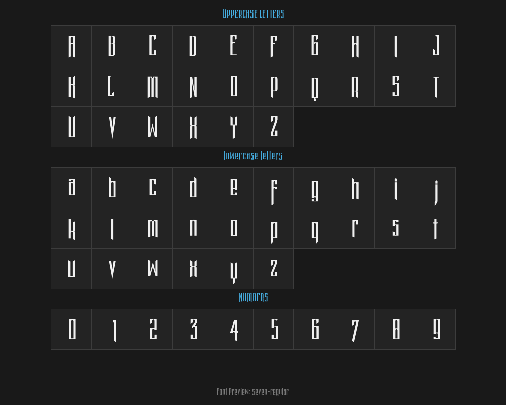 seven-regular is a font file with a size of 0.02 MB. The full font name is Seven-Regular, 001.000 version. It contains 243 characters, supports 8 Chinese characters. The copyright belongs to Seven. seven-regular font is available for free download, but commercial use requires confirmation on the Seven official website whether it's free for commercial use.