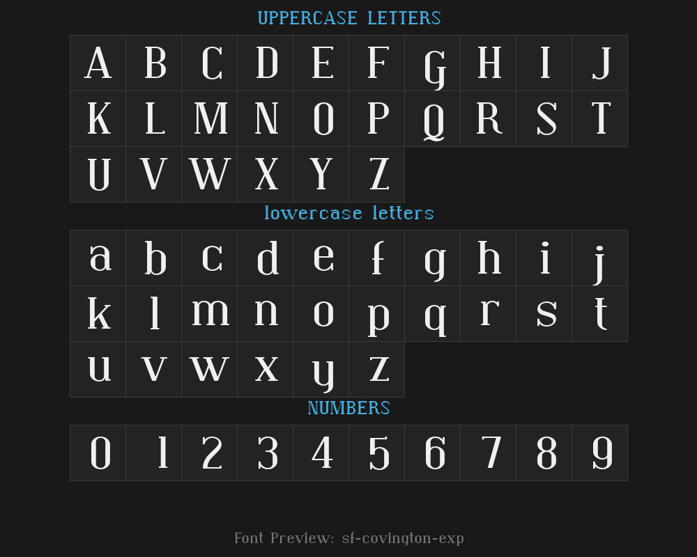 sf-covington-exp is a font file with a size of 0.08 MB. The full font name is SF Covington Exp, Version 1.1 version. It contains 223 characters, supports 8 Chinese characters. The copyright belongs to SF Covington Exp. sf-covington-exp font is available for free download, but commercial use requires confirmation on the SF Covington Exp official website whether it's free for commercial use.