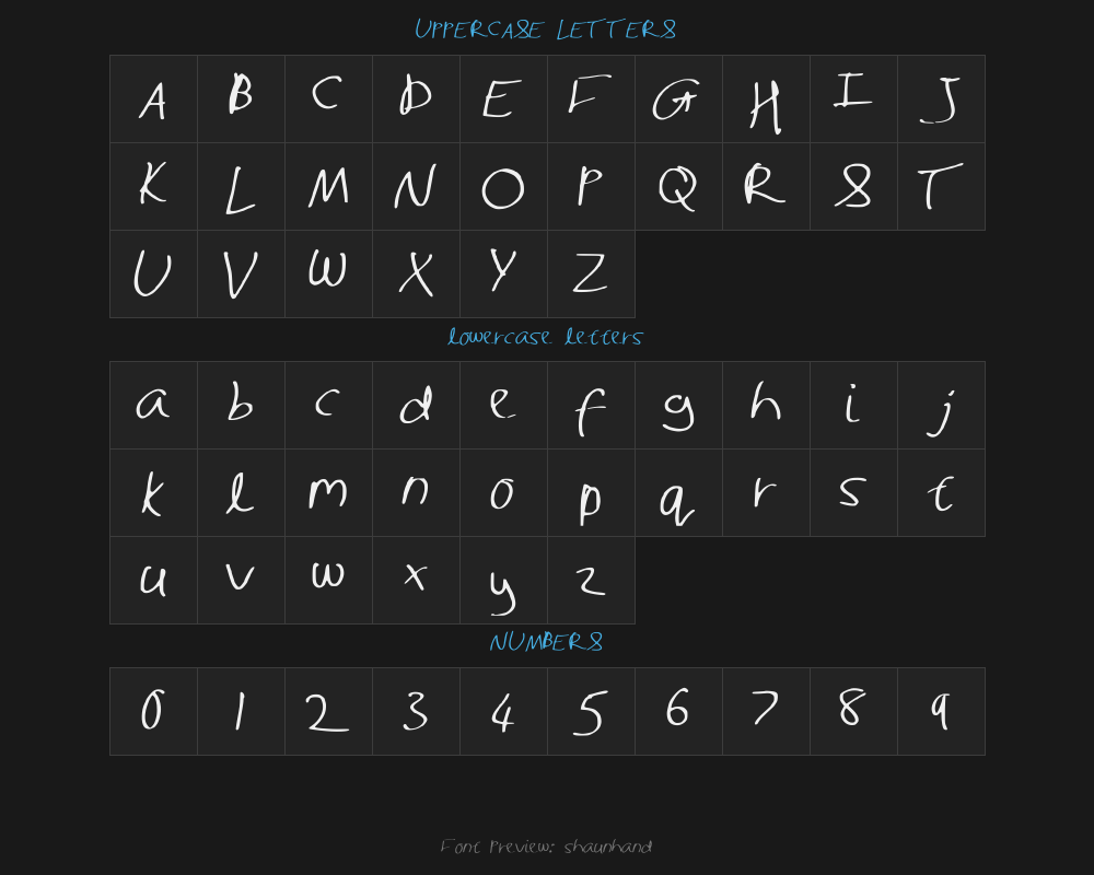 shaunhand is a font file with a size of 0.02 MB. The full font name is ShaunHand, Version 001.000 version. It contains 140 characters, supports 8 Chinese characters. The copyright belongs to ShaunHand. shaunhand font is available for free download, but commercial use requires confirmation on the ShaunHand official website whether it's free for commercial use.