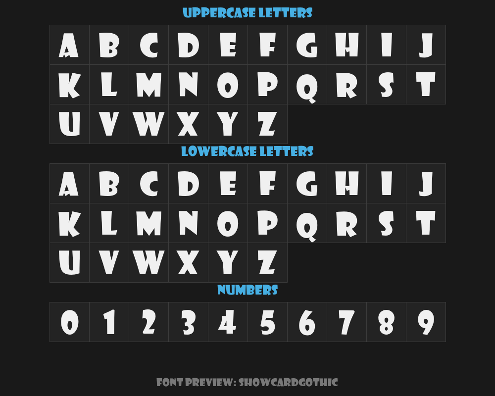 showcardgothic is a font file with a size of 0.04 MB. The full font name is ShowcardGothic, 001.000 version. It contains 244 characters, supports 8 Chinese characters. The copyright belongs to Showcard Gothic. showcardgothic font is available for free download, but commercial use requires confirmation on the Showcard Gothic official website whether it's free for commercial use.