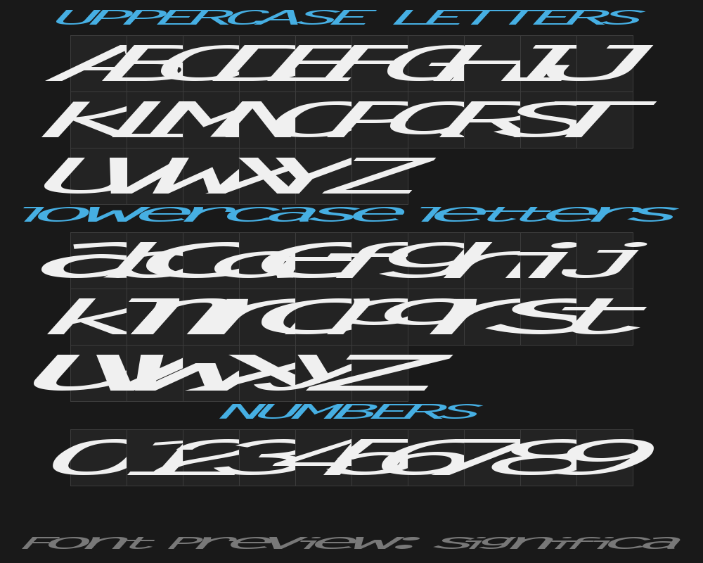 significa is a font file with a size of 0.08 MB. The full font name is Significa, Macromedia Fontographer 4.1.5 27.11.2000 version. It contains 218 characters, supports 8 Chinese characters. The copyright belongs to Significa. significa font is available for free download, but commercial use requires confirmation on the Significa official website whether it's free for commercial use.