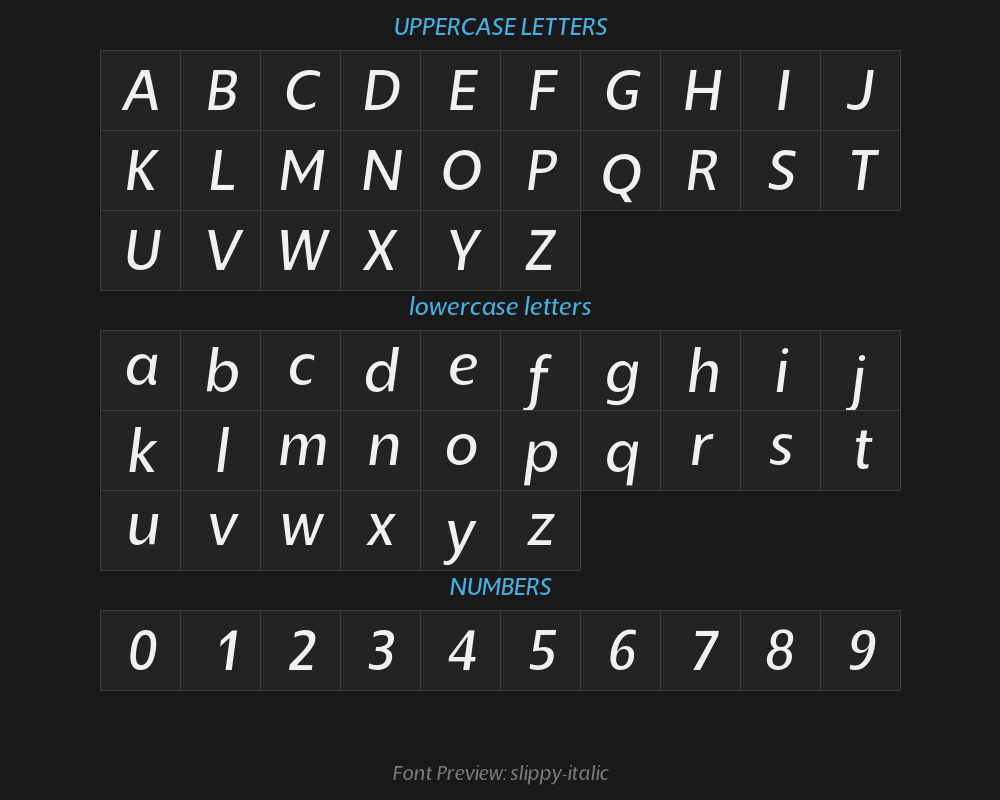 slippy-italic is a font file with a size of 0.02 MB. The full font name is Slippy-Italic, 001.000 version. It contains 229 characters, supports 8 Chinese characters. The copyright belongs to Slippy. slippy-italic font is available for free download, but commercial use requires confirmation on the Slippy official website whether it's free for commercial use.