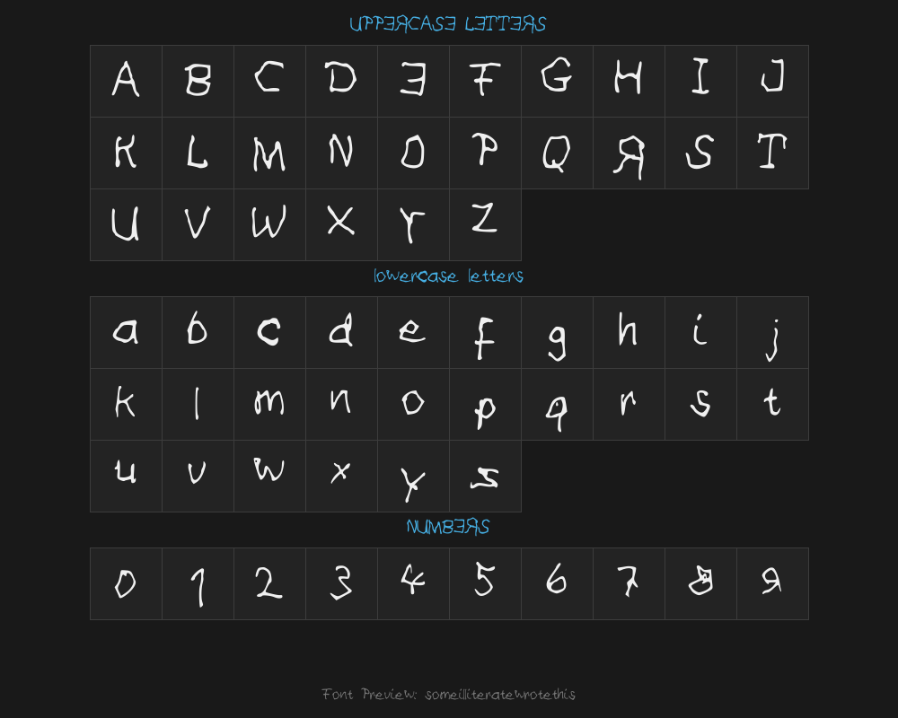 someilliteratewrotethis is a font file with a size of 0.03 MB. The full font name is SomeIlliteratewrotethis, Version 001.000 version. It contains 140 characters, supports 8 Chinese characters. The copyright belongs to SomeIlliteratewrotethis. someilliteratewrotethis font is available for free download, but commercial use requires confirmation on the SomeIlliteratewrotethis official website whether it's free for commercial use.