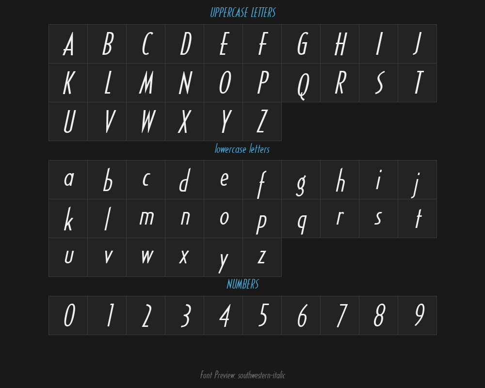 southwestern-italic is a font file with a size of 0.05 MB. The full font name is Southwestern Italic, 1.0 Thu Mar 14 15 03 22 1996 version. It contains 222 characters, supports 8 Chinese characters. The copyright belongs to Southwestern. southwestern-italic font is available for free download, but commercial use requires confirmation on the Southwestern official website whether it's free for commercial use.
