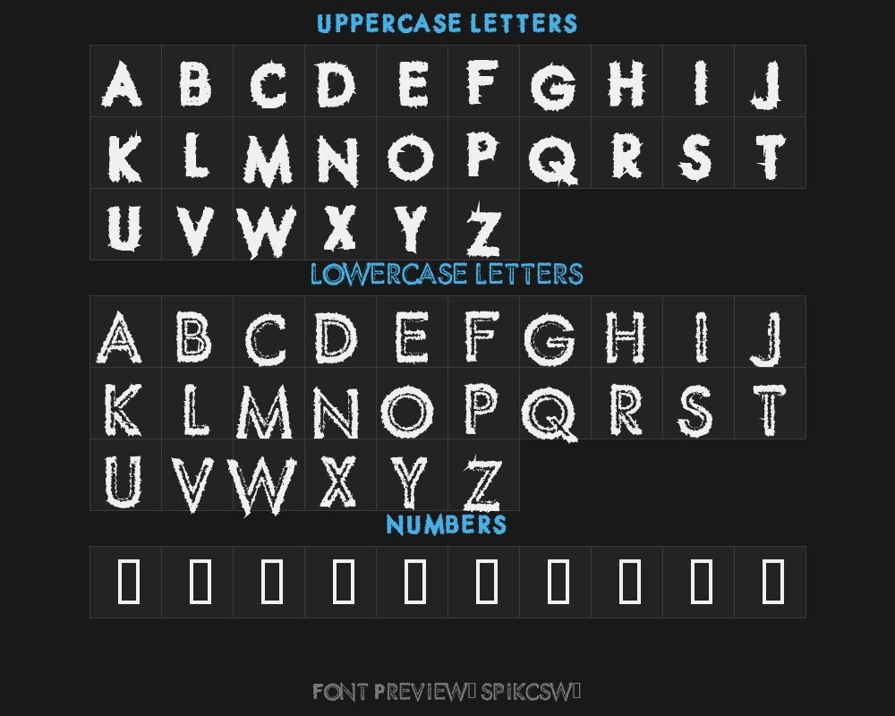 spikcsw_ is a font file with a size of 0.08 MB. The full font name is Spike Crumb Swollen, Macromedia Fontographer 4.1.2 5 5 97 version. It contains 54 characters, supports 8 Chinese characters. The copyright belongs to Spike Crumb Swollen. spikcsw_ font is available for free download, but commercial use requires confirmation on the Spike Crumb Swollen official website whether it's free for commercial use.