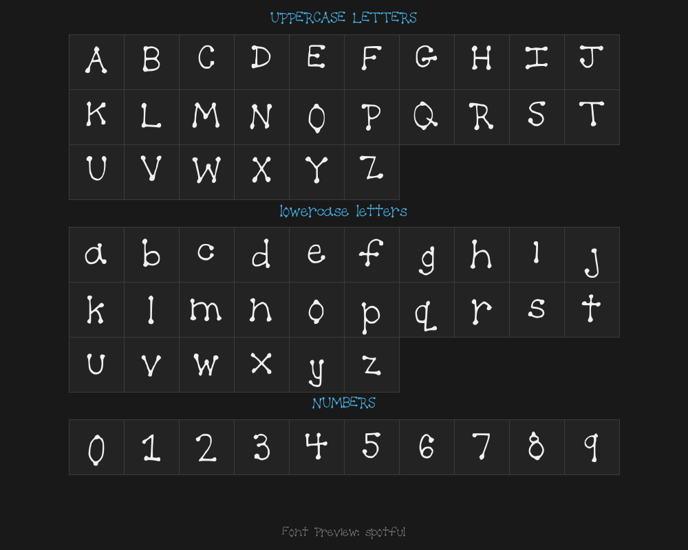 spotful is a font file with a size of 0.02 MB. The full font name is Spotful, Version 001.000 version. It contains 140 characters, supports 8 Chinese characters. The copyright belongs to Spotful. spotful font is available for free download, but commercial use requires confirmation on the Spotful official website whether it's free for commercial use.