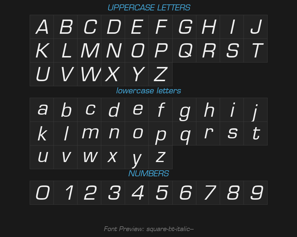 square721-bt-italic-1- is a font file with a size of 0.03 MB. The full font name is Square721 BT-Italic, 1.0 version. It contains 209 characters, supports 8 Chinese characters. The copyright belongs to Square721 BT. square721-bt-italic-1- font is available for free download, but commercial use requires confirmation on the Square721 BT official website whether it's free for commercial use.