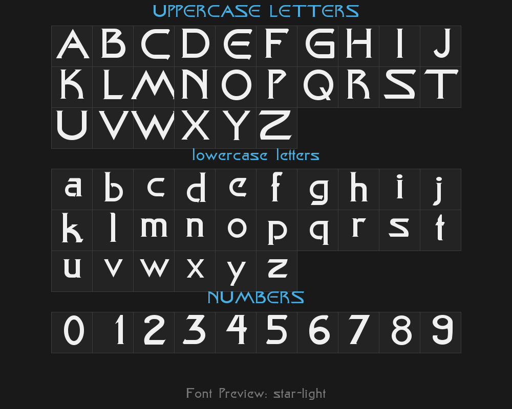 star-light is a font file with a size of 0.05 MB. The full font name is Star Light, V 1.0 version. It contains 214 characters, supports 8 Chinese characters. The copyright belongs to Star Light. star-light font is available for free download, but commercial use requires confirmation on the Star Light official website whether it's free for commercial use.