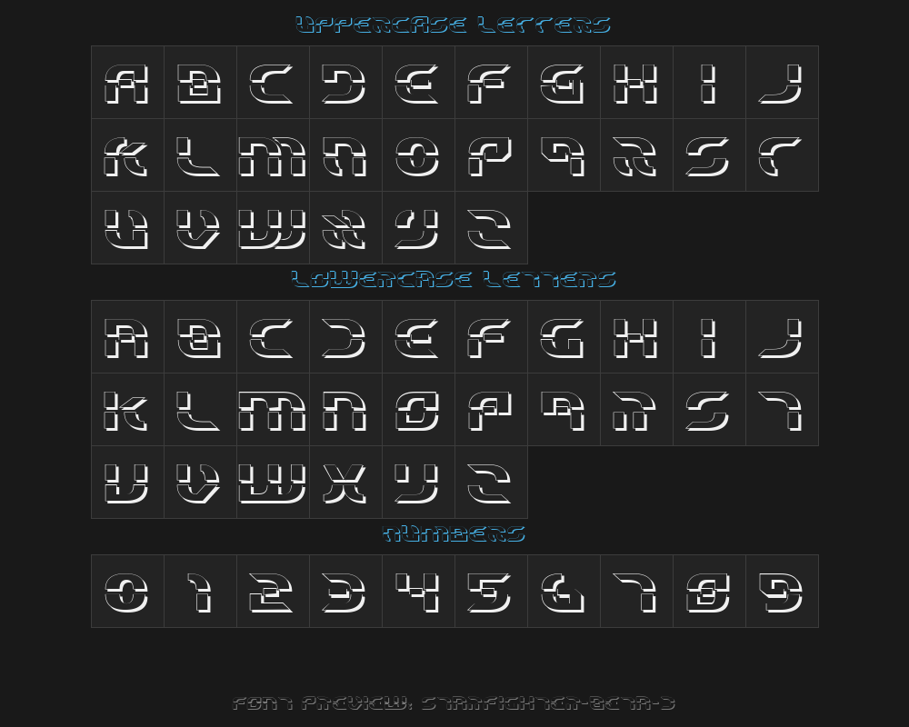 starfighter-beta-3d is a font file with a size of 0.11 MB. The full font name is Starfighter Beta 3D, 2 version. It contains 220 characters, supports 8 Chinese characters. The copyright belongs to Starfighter Beta 3D. starfighter-beta-3d font is available for free download, but commercial use requires confirmation on the Starfighter Beta 3D official website whether it's free for commercial use.