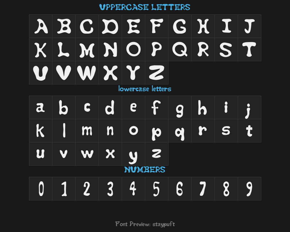 staypuft is a font file with a size of 0.03 MB. The full font name is StayPuft, Version 000.004 version. It contains 209 characters, supports 8 Chinese characters. The copyright belongs to StayPuft. staypuft font is available for free download, but commercial use requires confirmation on the StayPuft official website whether it's free for commercial use.