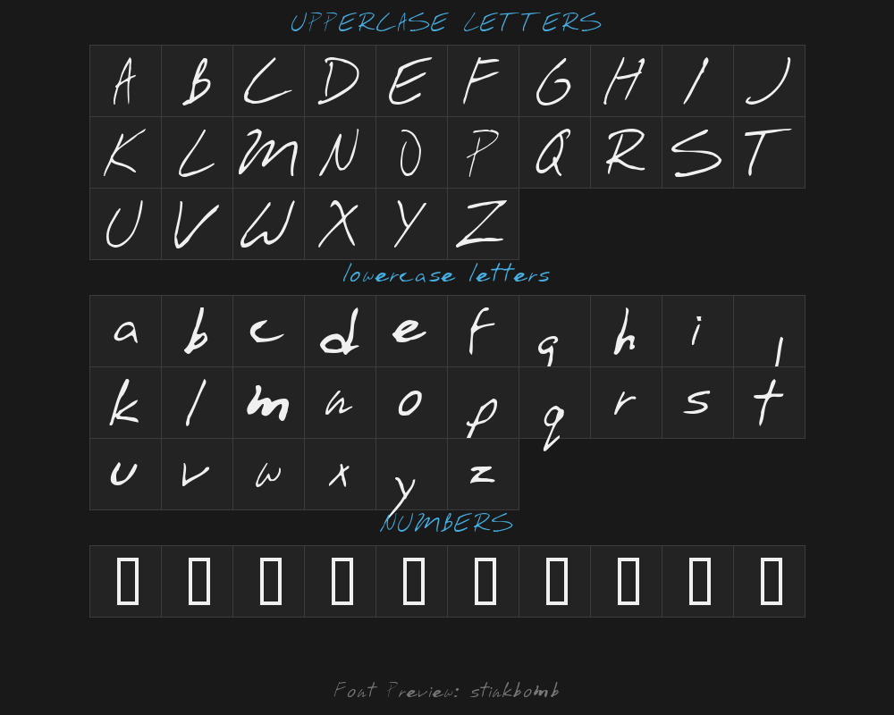 stinkbomb is a font file with a size of 0.02 MB. The full font name is StinkBomb, Macromedia Fontographer 4.1 2 23 98 version. It contains 66 characters, supports 8 Chinese characters. The copyright belongs to StinkBomb. stinkbomb font is available for free download, but commercial use requires confirmation on the StinkBomb official website whether it's free for commercial use.