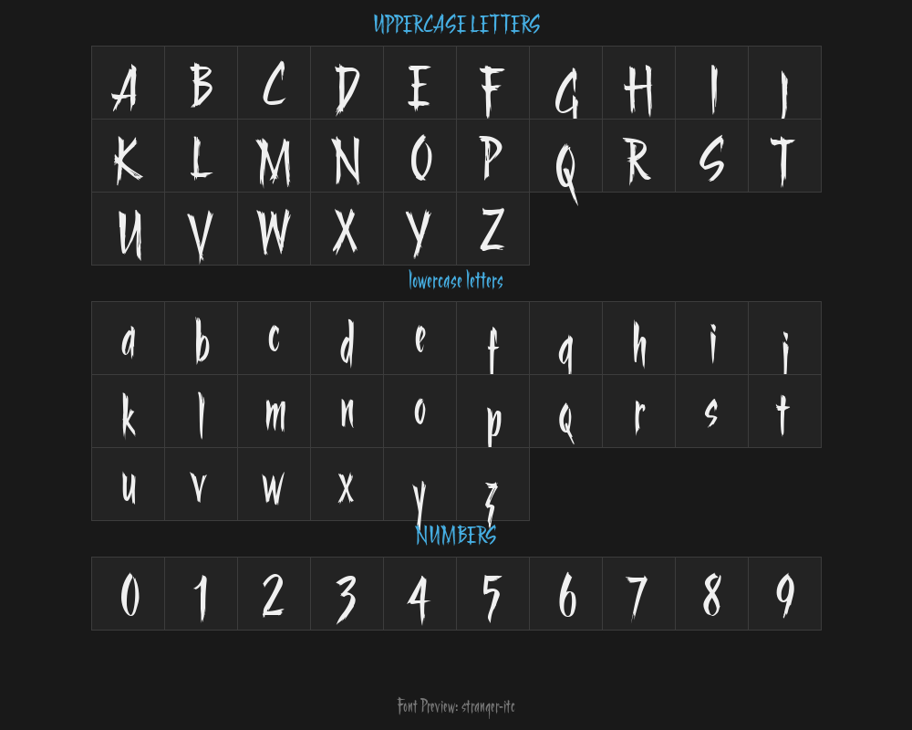 stranger-itc is a font file with a size of 0.10 MB. The full font name is Stranger ITC, 001.001 version. It contains 231 characters, supports 8 Chinese characters. The copyright belongs to Stranger ITC. stranger-itc font is available for free download, but commercial use requires confirmation on the Stranger ITC official website whether it's free for commercial use.