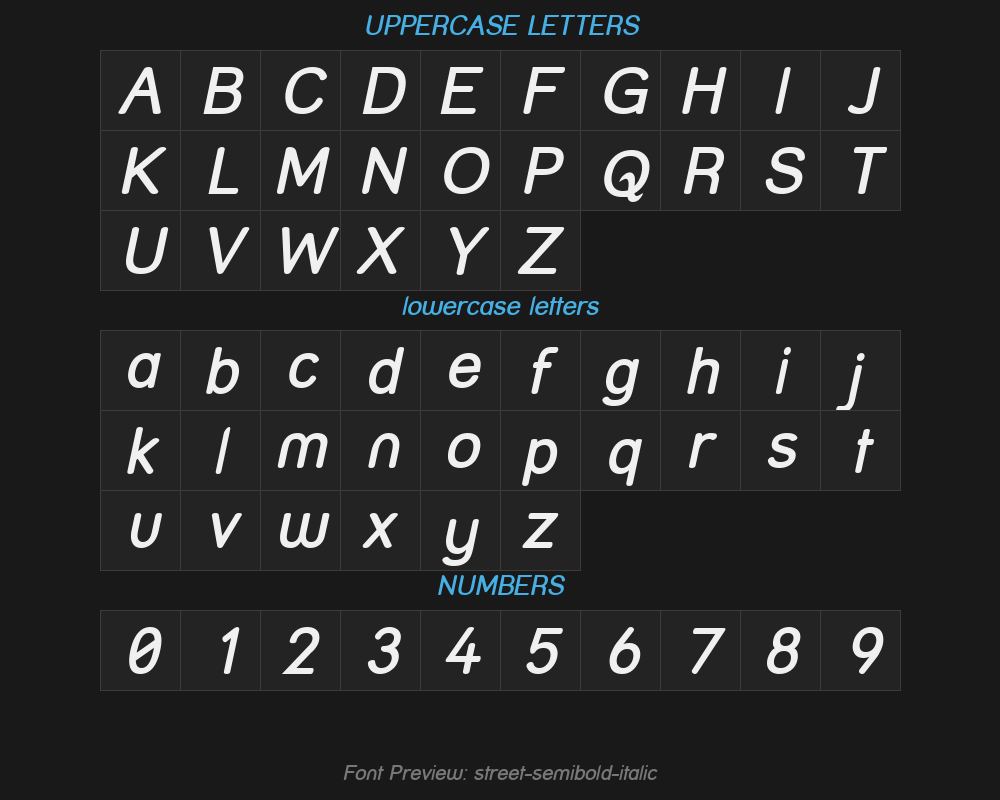 street-semibold-italic is a font file with a size of 0.06 MB. The full font name is Street SemiBold Italic, 1.0 version. It contains 225 characters, supports 8 Chinese characters. The copyright belongs to Street SemiBold Italic. street-semibold-italic font is available for free download, but commercial use requires confirmation on the Street SemiBold Italic official website whether it's free for commercial use.